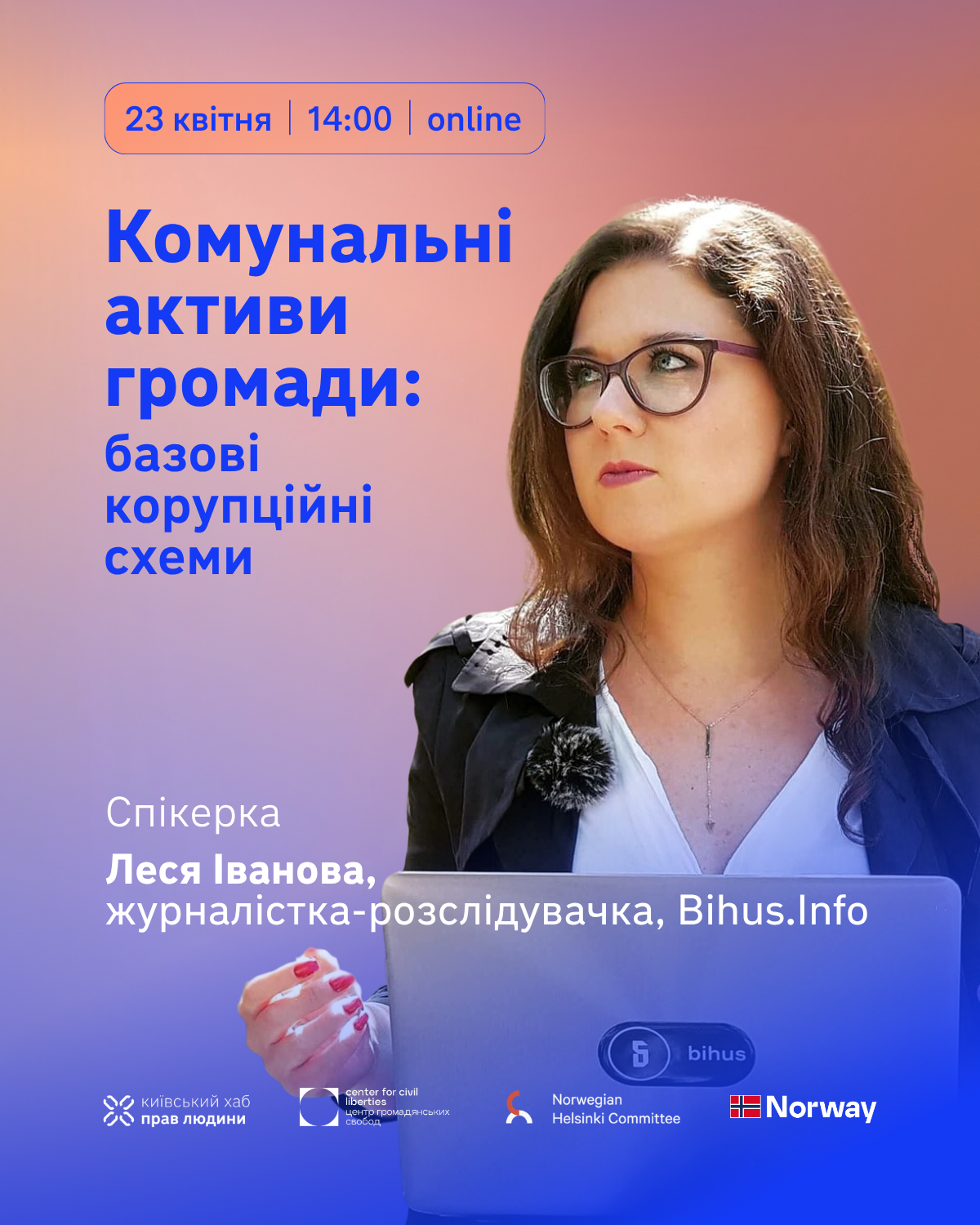 Вебінар від Лесі Іванової, журналістки-розслідувачка Bihus.Info буде присвячений прикладним речам, які стосуються кожного і кожної, кому не байдужий добробут власної громади. Озброївшись знаннями будь-хто може зробити свій посильний внесок у протидію корупції та зловживанням.